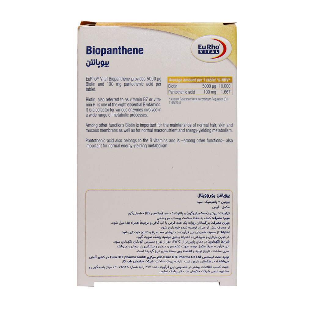 - حاوی 5000 میکروگرم بیوتین و 100 میلیگرم پانتوتنیک اسید به ازای هر قرص