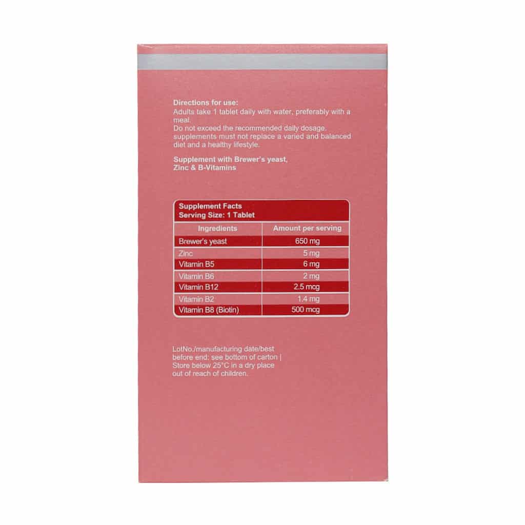 - حاوی مخمر آبجو، زینک، بیوتین، ویتامین B2، ویتامین B5، ویتامین B6 و ویتامین B12