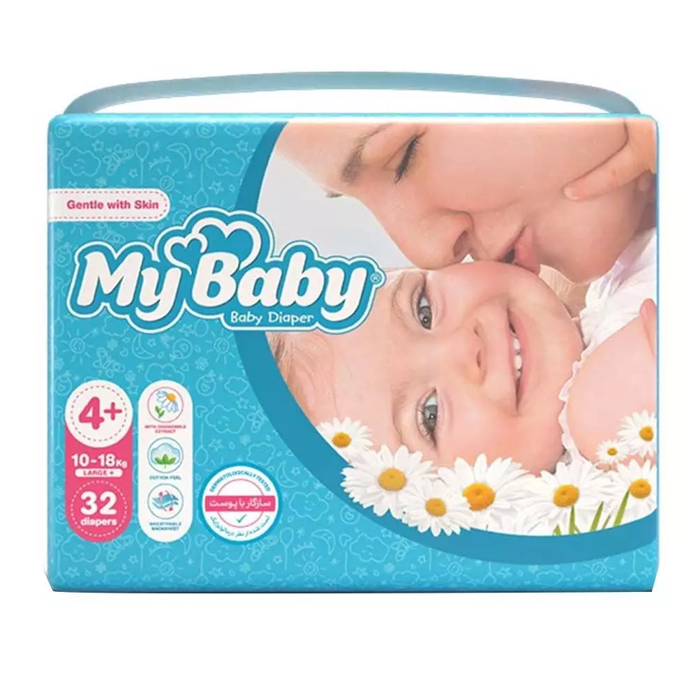 این پوشک مای بیبی سایز 4 پلاس در بسته 32 عددی بوده و مناسب نوزاد با وزن 10 تا 18 کیلو می باشد.این پوشک دارای قدرت جذب فوق العاده می باشد همچنین حاوی عصاره بابونه بوده که باعث میشه نوزاد دچار حساسیت پوستی نشود.